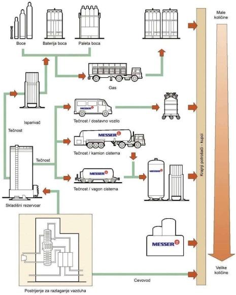U povezanim industrijskim oblastima, za veoma velike potrošače, npr. za proizvođače čelika ili hemijsko-farmaceutsku industriju, snabdevanje gasom se može vršiti centralno, preko sistema razvodnog cevovoda, kojim upravlja Messer.